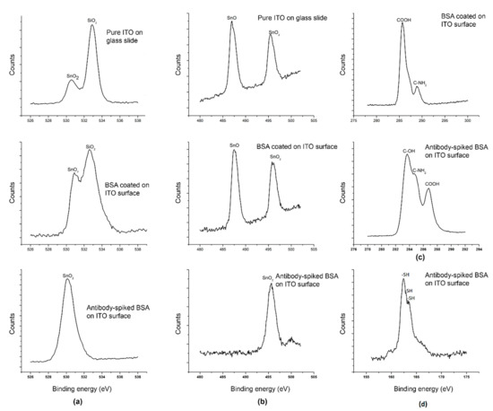 Comparing the spectra of the carbon 1s for BSA-coated on the ITO surface and the sample consisting of antibody-spiked BSA coated on the ITO surface (Figure 6c), the peak at 285.8 eV is assigned to the carboxylic groups, which we associate with the BSA immobilized on the ITO surface [37].