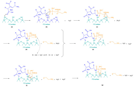 Considering that the ITO has been reported as a catalyst for many chemical reactions [32,33,34,35], the catalytic reactions of biomolecules on the surface of the ITO nanostructures could be contributing to the biosensing mechanism in our device. Herein, we proposed the catalytic effects of ITO on three main reactions: First, we bound the BSA molecule to the surface of the ITO through reactions between carboxylic groups of the BSA and hydroxyl groups of the ITO surface. Second, we conjugated the antibody by the reaction of the antibody with the BSA on the surface of the ITO. This results in charge transport from the BSA to the antibody and also moving the disulfide bonds of the antibody towards the surface of the ITO. Third, we changed the disulfide bonds of the antibody to thiol bonds by catalytic reactions of the protons on the surface of the ITO, which results in charge transport from the antibody to the surface of the ITO. The above mentioned interactions are explained in the following sections. However, prior to explaining the details, it should be noted that due to using the negatively charged BSA as a stabilizing agent, the charge transport and biosensing mechanisms might be limited to a net positive charge protein, i.e., an antibody. Moreover, due to proteins’ structural effects in antibodies on the charge transport and catalytic reactions that allows the biosensing, it is expected to have different calibration curves for different antibodies. Moreover, antibodies have different calibration curves in different matrices (i.e., blood). More comprehensive analytical studies are outside the scope of this proof of concept study and this mechanistic study and are the subjects of our future publications based on the extensive research ongoing in our lab currently.