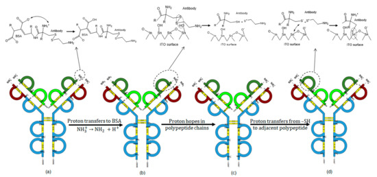 On the other hand, we suggest that antibodies conjugation with the BSA results in charge migration between the antibody and the BSA. BSA molecules are negatively charged under physiological conditions used here. There are 179 charged residues in a BSA molecule. Among those, 98 residues are negatively charged and 81 are positively charged [45]. Unlike the BSA, the net charge of the antibody is positive at pH 6 and 7 [46]. Conjugating antibodies with BSA leads to transfer of the proton from α-amino group () at the N-terminal end of a polypeptide of the antibody to a negatively charged residue in the BSA. Charge migration can take place over distances of a maximum of 20 angstroms in polypeptide chains [47,48,49,50]. The protons hop along the polypeptide chain of the antibody until reaching the disulfide bonds. This mechanism can also generate charges on the ITO surface.