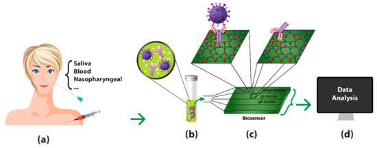 The schematic representation of the process for pathogen detection in samples from humans. (a) Sample is derived from the patient’s blood or other body fluids. (b) The schematic representation of the presence and immobilization of different biomarkers in the sample taken from the patient. (c) The specific bindings of different analytes to the sensor take place by using a multichannel transducer; a separate channel for each biomarker. (d) The response from the transducer is then transferred to the detector where the data are amplified and analyzed.