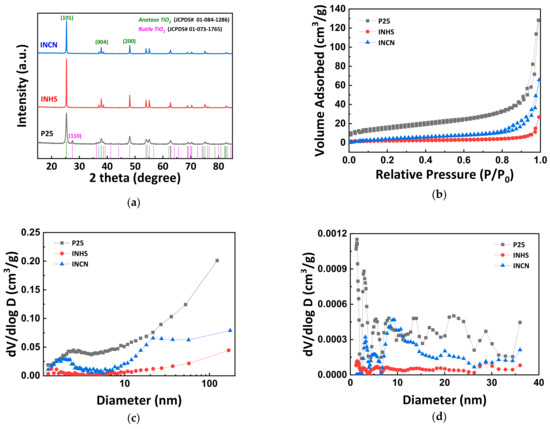 (a) XRD patterns, (b) N2 adsorption-desorption isotherms, and (c,d) BJH and NL-DFT pore size distribution at varying pore size ranges for P25, INHS, and as-synthesized INCN.