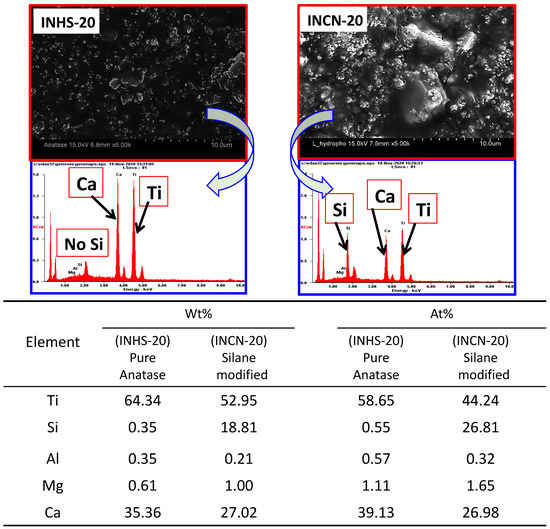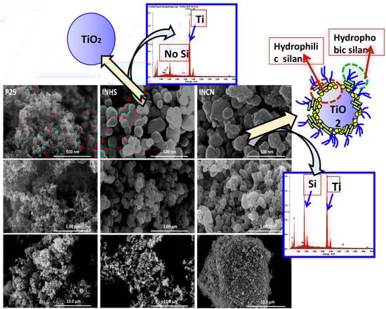 Scanning Electron Microscopy (SEM) representations of P25, INHS, and INCN are shown in Figure 2 at various magnifications. The particle size of P25 is about ~50 nm, in line with the XRD findings, while the size of INHS and INCN ranged from 150 to 250 nm, and they were agglomerated together. The altered TiO2 NPs (INCN) size and shape are close to that of INHS. This suggests that the shift in size and shape of TiO2 NPs will not be induced by both hydrophilic and hydrophobic silanes grafting. Figure 2 also shows the Energy-Dispersive X-ray Spectroscopy (EDS) results of INHS and INCN (before/after modification of silanes). The altered TiO2 (INCN) size and shape are close to precursor anatase TiO2 (INHS). Furthermore, the separated NPs could be found without covering of thick agglomerated layers of silanes after modification, indicating a successful uniform coating of silica layers on the surfaces of INHS. However, the INCN sample (Figure 2) was treated with a water glass to form the silanols instead of Al(OH)3, showing no peak of Al on EDS spectrum.