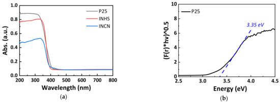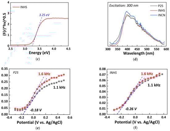 Figure 3a–c display the estimated UV-Vis Diffuse Reflectance Spectroscopy (DRS) spectra and the estimated absorption pattern of P25, INHS, and INCN. Intercepts of the extrapolation lines and the energy axis [48,53] show that the P25 and INHS energy bandgap (Eg) is respectively 3.35 eV (Figure 3b) and 3.25 eV (Figure 3c). The absorption band edge of the INHS sample is about 350 nm, which is the typical value for TiO2 anatase. Compared to P25, the absorption of light in INHS is more expanded to the lower photon energy regions by about ~10 nm. In addition, an absorption range close to that of the parent INHS is shown by INCN. Due to the surface coating (or screening), the primary absorption around 350 nm decreases by 30%, although its band edge or bandgap stays unchanged after functionalization [54]. Also, the reduced UV absorption could be attributed to the lower mass composition of TiO2 in INCN. Mott-Schottky experiments further tested the electronic structure of the components [51]. The emission spectrum of the INHS sample is centered on 400 nm and resembles that of P25 in terms of intensity and peak position (Figure 3d). We note that absorption extension in the INHS sample is little reflected on the emission spectrum. This probably indicates that the difference in absorption was a result of the scattering effect. Again, the optical property of the INHS sample remains intact before and after functionalization.