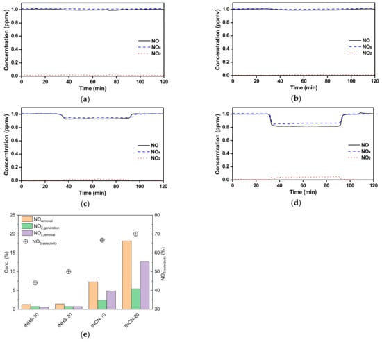 NO, NO2, and NOx concentration variation profiles during 1 h of UV irradiation for (a) INHS-10, (b) INHS-20, (c) INCN-10, and (d) INCN-20; (e) the average NO, NO2, NOx, and NO3− selectivity values after UV irradiation.