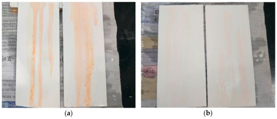 The photocatalytic paint INCN-20 showed good self-cleaning properties when applied on a ceramic substrate. The self-cleaning property was tested by spraying oil on the treated film under weak UV conditions and subsequent washing. To the ‘authors’ knowledge, the majority of self-cleaning superhydrophobic coats are used mainly for hydrophilic pollutants and not for oils, as oils typically result in superhydrophobicity failure. This phenomenon happens because of the lower surface tension of oil than that of water, which allows the oil to reach the surfaces. The self-cleaning tests of the painted surfaces after oil spraying and subsequent washing are presented in Figure 8. As shown in Figure 8a, with the general paint in the absence of INCN, the top surface of the coated glass substrate became contaminated from the oil spraying, and after washing, the oil spread on the surface of the coating by compromising the self-cleaning property. On the other hand, Figure 8b depicted the superior self-cleaning property of INCN-20 after the oil spraying test.