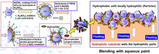 Initially, specific amounts of anatase TiO2 (INHS) NPs were well dispersed in deionized water and ethanol with the help of ultrasonication for 10 min. The ethanol content of the dispersion was twice that of INHS, and the wt.% of water was maintained at 40% of INHS. Then 3–7 wt.% of Al2(SO4)3 was added to the dispersion to employ the Al(OH)3 coating (or The silanols (Si(OH)x) were coated on the surfaces of anatase INHS by water glass coating and pH adjustment at 5–6). Besides, TEOS and R-Si(OEt)3 (R = (CH2)7CH3, or (CH2)11CH3)) were added to the dispersion at 20 wt.%, and 30 wt.% corresponding to the utilized INHS NPs. HCl was used to maintain the pH of dispersion within the range of 4–5. Later the dispersion was stirred well and kept for six h for hydrolysis and the formation of a coating on the surface of INHS NPs. Then, (CH3)3-Si-Cl was hydrolyzed to hydrophobically coat the surface of INHS NPs to prepare the composite photocatalyst. At this time, (CH3)3-Si-Cl corresponding to 10% to 30% of the weight of the TiO2 powder was added, stirred, and reacted at room temperature for two h to adjust the hydrophobicity of the INHS surface. From here on, the coated INHS NPs generated in this study are termed as INCN. Figure 9 depicted the simple schematic for the fabrication process of the INCN.