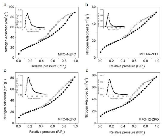 The porosity of the as-prepared materials was probed with N2 physisorption measurements. Figure 2 shows N2 adsorption–desorption isotherms and the corresponding pore size distribution plots for the MFO-ZFO MNAs. The corresponding plots for the ZFO and MFO MNAs are given in Figure S1. All the isotherms show typical type-IV curves, according to the IUPAC classification, with a distinct H3-type hysteresis loop, being characteristic of porous solids with slit-like mesopores. The specific surface areas and total pore volumes of the composite materials were measured to be 68–91 m2 g−1 and 0.09–0.14 cm3 g−1, respectively, which are slightly lower than the surface area and pore volume of single component ZFO and MFO MNAs (105–106 m2 g−1, 0.15–0.21 cm3 g−1, see Figure S1). The pore size in these materials was derived from the adsorption branch of isotherms using the NLDFT method (based on slit-like pores). The NLDFT analysis indicated quite narrow size distributions of pores with an average pore diameter of ~5 to 6 nm (insets of Figure 2 and Figure S1). Table 1 summarizes the textural parameters of the prepared catalyst.