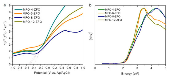 (a) Mott-Schottky and (b) Tauc plots of the dual component MFO-ZFO MNAs catalysts. In panel (a), the red lines show the EFB potential of the semiconductors.