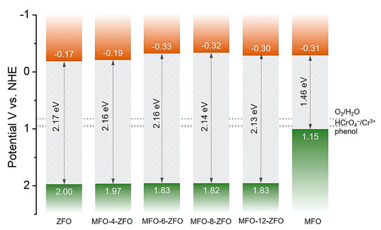 Energy band diagrams of ZFO, MFO, and MFO-ZFO MNAs catalysts. The redox potential levels of O2/H2O (0.82 V), HCrO4–/Cr3+ (0.94 V), and phenol (0.96 V) are also presented. All the potentials are given versus the NHE scale at pH = 7.