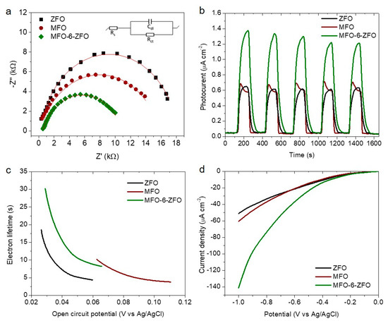 Electrochemical impedance spectroscopy was also used to study the charge transfer events at the catalyst/electrolyte interface. Figure 6a shows the Nyquist plots of MFO-6-ZFO compared to that of single component ZFO and MFO samples. All measurements were carried out at open circuit potential from 1 Hz to 1 MHz using an alternating current amplitude of 10 mV in 0.5 NaSO4 solution. A Randles circuit (inset of Figure 6a) was used to fit the impedance data and interpret the charge transfer resistance (Rct) of the catalysts. From the fitting results, the Rct value was determined to be 17.8, 15.6, and 10.4 kΩ for ZFO, MFO, and MFO-6-ZFO, respectively. This suggests that MFO-6-ZFO exhibits more efficient charge transport at the interface of electrode/electrolyte, as we will show below, due to the better electron-hole separation in the MFO/ZFO junction.