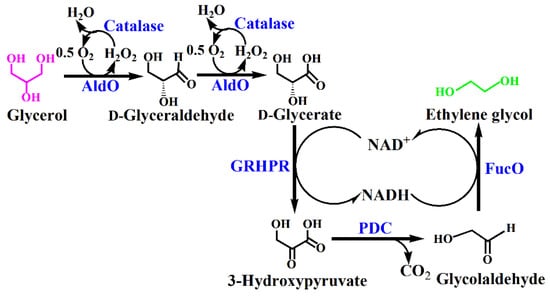 Here, an artificial enzymatic reaction cascade was designed for the conversion of glycerol into ethylene glycol (Figure 1). Glycerol is first oxidized to d-glycerate via d-glyceraldehyde by alditol oxidase (Aldo) catalyzed two-step oxidation. The d-Glycerate produced from glycerol is then transformed into 3-hydroxypyruvate by oxidized nicotinamide adenine dinucleotide (NAD+)-dependent glyoxylate/hydroxypyruvate reductase (GRHPR). Then, 3-hydroxypyruvate is decarboxylated to glycolaldehyde by pyruvate decarboxylase (PDC). Finally, the glycolaldehyde is reduced into ethylene glycol by lactaldehyde:propanediol oxidoreductase (FucO), using the NADH produced during the d-glycerate dehydrogenation as the cofactor. The H2O2 generated during the oxidation of the glycerol is decomposed by catalase in order to avoid the spontaneous oxidative of the intermediate products [20]. As a result, one mole of glycerol can generate one mole of ethylene glycol.