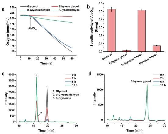 The target product of this study, ethylene glycol, is the simplest 1,2-diol, and is also the possible substrate of AldOmt. Thus, the activity of AldOmt toward ethylene glycol was assayed using a Clark-type oxygen electrode, as described in a previous study [24]. As shown in Figure 2a, the AldOmt-dependent oxygen consumption was rather low with the addition of ethylene glycol, while noticeable oxygen consumption was observed when glycerol was added (Figure 2c). The estimated specific activities of AldOmt for glycerol and ethylene glycol were 0.53 ± 0.03 U/mg and 0.018 ± 0.004 U/mg, respectively (Figure 2b). The oxidative activities of AldOmt toward glycerol and ethylene glycol were also determined by high-performance liquid chromatography (HPLC) analysis. As shown in Figure 2c,d, the depletion of glycerol could be observed obviously, while very little consumption of ethylene glycol was detected.