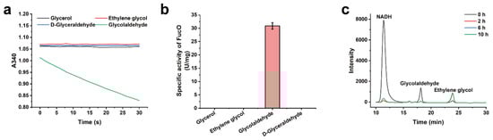 The NADH-dependent reduction of glycolaldehyde can regenerate the NAD+ required for d-glycerate dehydrogenation, and can support the production of ethylene glycol. The lactaldehyde:propanediol oxidoreductase of Escherichia coli (FucO) was reported to reduce glycolaldehyde [27,28]. This enzyme has been overexpressed in E. coli for in vivo ethylene glycol production via a synthetic pathway [29]. In this study, the activity of FucO using glycolaldehyde and NADH as the substrates was also assayed (Figure 3a,b). The specific activity of FucO toward glycolaldehyde reduction was calculated to be 30.9 ± 1.2 U/mg (Figure 3b). The HPLC analysis results showed that FucO rapidly reduces glycolaldehyde into ethylene glycol (Figure 3c).