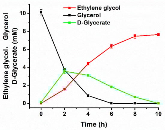 AldOmt, GRHPR, PDC and FucO were overexpressed, purified (Figure S3), and coupled with commercial catalase from A. niger (Sigma-Aldrich, St. Louis, MO, USA) for the production of ethylene glycol from glycerol. As shown in Figure 4, 7.64 ± 0.15 mM ethylene glycol was generated from 10 mM glycerol in 10 h. Some chemists have also attempted to produce ethylene glycol from glycerol by hydrogenolysis. For example, Feng and his colleagues studied the conversion of glycerol to ethylene glycol over Ru-Co/ZrO2 catalysts [30]. However, this catalyst exhibited higher selectivity toward 1,2-propanediol generation than ethylene glycol production. The yield of ethylene glycol was only 0.30 g/g glycerol. Ueda and his colleagues reported the conversion of glycerol to ethylene glycol over Pt-modified Ni catalysts under the conditions of 453 K and 8.0 MPa [10]. The yield of ethylene glycol was 0.479 g/g, which was lower than that of a biocatalytic process utilizing the artificially designed enzymatic cascade (0.515 ± 0.1 g/g) under modest reaction conditions (303 K, 0.1 MPa).