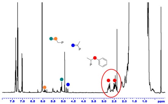 Representative 1H NMR spectrum (tetrachloroethane-d2, 120 °C) of a polypropylene sample obtained with a Cp-phosphinimide Ti catalyst, showing the presence of benzyl chain ends (red) along with more typical olefinic terminations (blue, green, orange). Adapted with permission from Reference [35]. Copyright 2016 American Chemical Society.