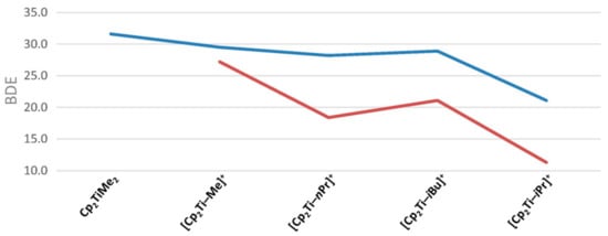 Density functional theory (DFT) calculated BDEs for Cp2TiMe2 and [Cp2Ti–R]+ naked (blue trace) and olefin stabilized (red trace) cations at 298 K. Adapted with permission from Reference [36].