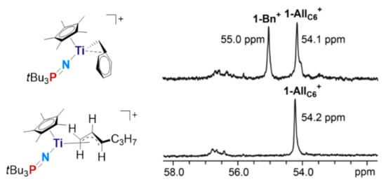 31P NMR (toluene-d8, 298 K) spectra of the Ti(IV)-benzyl (‘1-Bn+’) and Ti(IV)-allyl (‘1-AllC6+’) intermediates observed under polymerization conditions by reacting 1′-tBu with ~10 (bottom) or >100 (top) eq. of 1-hexene. Reproduced with permission from Reference [38].