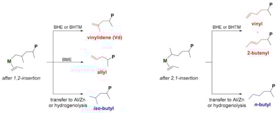 Unsaturated chain ends are typically produced via β-H elimination (BHE) [5], β-H transfer to the monomer (BHTM) [26,27,28] and, more rarely, β-methyl elimination (BME) [29,30], as depicted in Scheme 1 for the representative case of propene polymerization. Saturated chain ends, instead, usually derive from chain transfer to a main group metal cocatalyst (e.g., Al and Zn alkyls) [31,32] or reaction with molecular hydrogen (Scheme 1) [33,34]; additionally, they can derive from chain reinitiation via monomer insertion into metal-hydride and metal-alkyl species, generated after BHE/hydrogenolysis and BHTM/BME/chain transfer to the cocatalyst, respectively [5]. These chain termination mechanisms and their correlations with polymer microstructure have been extensively studied, and are discussed in depth in a number of reviews [3,4,5,8].
