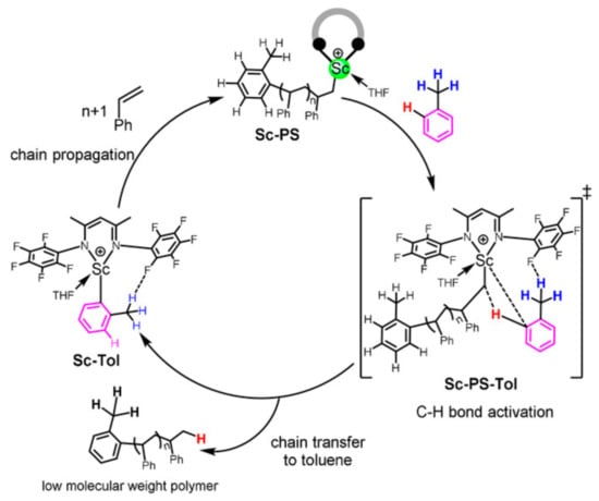 Proposed mechanism for CTS in additive-free styrene polymerization by fluorinated β-diketiminate Sc catalysts. Reproduced with permission from Reference [40].