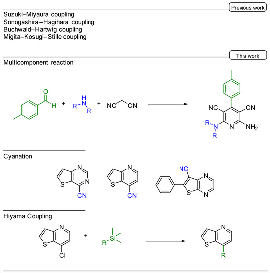 - Campos, J.F.; Queiroz, M.-J.R.P.; Berteina-Raboin, S. Synthesis of new thieno[3,2-b]pyridines and thieno[3,2-b]pyrazines by palladium cross-coupling. ChemistrySelect 2017, 24, 6945–6948. [Google Scholar] [CrossRef]
