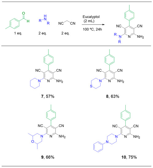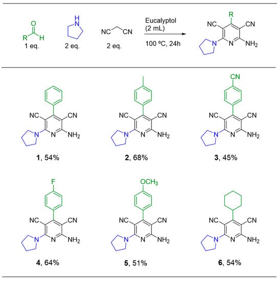The expected compound (1) was obtained in 28 to 54% yield. Adding a catalyst to the reaction was always detrimental to the yield when compared to a catalyst-free reaction performed with the same stoichiometry and temperature. The best result was obtained without catalyst using one equivalent of benzaldehyde and two equivalents of pyrrolidine and malonitrile (Table 1, Entry 2). For the synthesis of compound 1, this solvent substitution proved to be advantageous over the above-mentioned studies that used chloroform (32%) [23] and ethanol (52%) [24]. However, our yield was lower when compared to that of the team that performed the reaction in methanol (79%) [25]. Nevertheless, it should be highlighted that the 79% yield was obtained with the addition of DMAP (20 mol%) as catalyst. To test which parameter influenced the yield, we performed the reaction in methanol without catalyst and then verified that the use of eucalyptol resulted in a higher yield when the reaction mixture was catalyst-free. With the best reaction conditions in hand, we proceeded to analyze the scope and limitations of the reaction.