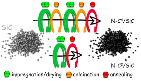 As far as N-C2/SiC is concerned, it was obtained by soaking SiC twice in the impregnation solution, evaporating the excess of water at 40 °C for 2 h, drying the sample at 130 °C overnight before moving it directly to the annealing phase at 900 °C under inert atmosphere.