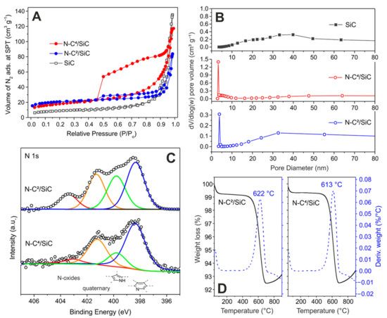 (A) N2 adsorption-desorption isotherm linear plot of SiC (light grey curve), N-C2/SiC (blue curve) and N-C4/SiC samples (red curve) recorded at 77 K along with (B) the respective pore-size distributions measured (BJH method). (C) High-resolution XPS N 1s core level region of N-C2/SiC (up) and N-C4/SiC (down) at comparison, along with the relative curves fittings. (D) Thermogravimetric/derivative of the thermogravimetric curves (TG/DTG) profiles of N-C2/SiC (left-side hand) and N-C4/SiC (right-side hand) at comparison. Weight loss is measured arbitrarily in the 200–700 °C temperature range. Operative conditions: Air, 50 mL/min; heating rate: From 40 to 900 °C at 10 °C/min.