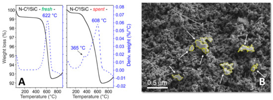 The excellent coke resistance of N-C2/SiC catalyst in the presence of relatively high concentrations of aromatics in the gas stream (40,000 ppm), has been confirmed by the analysis of the recovered N-C2/SiC (spent catalyst) after 720 h on reaction. Figure 5A refers to the TGA analysis of the freshly prepared N-C2/SiC (left-side hand) with its spent (right-side hand) counterpart put at comparison.