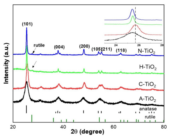 To determine the crystal structure and possible phase changes after the hydrogenation and nitridation treatments, the X-ray diffraction (XRD) patterns of the TiO2 samples annealed in the presence of different gases were collected and are presented in Figure 2. All the TiO2 nanocrystals display almost the same XRD patterns, which can be indexed mainly to the pure anatase phase. More specifically, the peaks at 2θ = 25.2°, 37.7°, 48.0°, 53.8°, 55.2°, and 62.7° are indexed to the (101), (004), (200), (105), (211), and (118) crystal planes of anatase (JCPDS Card No.21-1272), respectively. The intense XRD diffraction peaks for the H- and N-TiO2 at 2θ = 25.4° samples indicate their improved crystallinity, in accordance with the SEM observations above. The crystallite size of all the samples was calculated using the Scherrer equation based on the XRD spectra. The results show that the crystallite sizes are increasing following the trend: A-TiO2 (5.4 nm) < C-TiO2 (13.1 nm) < H-TiO2 (21.6 nm) < N-TiO2 (29.6 nm). The calculated values indicate that calcination under H2 and NH3 atmosphere promoted the growth of the TiO2 naono- grains. Consequently, we can assume that the surface area of each powder sample decreases with the same trend. Compared to the C-TiO2, the (101) diffraction peak (Figure 2 inset) of the rest three samples shows a slight shift towards a lower angle, which can be ascribed to lattice expansion [32]. It is reasonable to assume that this expansion is the result of the lattice disorder and the interstitial/substitutional N incorporation in the case of the H- and N-TiO2 samples. Moreover, the XRD patterns of the H-TiO2 and N-TiO2 samples show a small amount of rutile phase. Indeed, the characteristic diffraction peaks at 27.5°, 36.1° and 41.2° are attributed to the (110), (101) and (111) facets of rutile, respectively (JCPDS Card No. 21-1276). The rutile phase in the C-TiO2 sample is not obvious from the corresponding XRD pattern, but it may be hindered by the lower degree of crystallinity and obscured by the background signal.