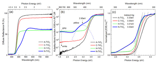The absorption properties of the TiO2 powders derived from the diffuse reflectance measurements at room temperature are summarized in Figure 4. The bandgap energy and the dominant type of optical transitions can be determined from the onset and linearity of the absorption edge by applying standard Kubelka–Munk [34] and Tauc [35] treatment to the DRS spectra in Figure 4a. The absorption spectra, represented by K-M function in Figure 4b, explain the coloration of TiO2 powders apparent in Figure 1a. The dissimilar yet spectrally uniform absorption throughout the visible range leads to a white/grey appearance of the A-TiO2, C-TiO2 and H-TiO2, whereas the yellow color of N-TiO2 is a result of higher absorption in the blue-green region (400–500 nm). Note that unlike other samples, N-TiO2 exhibits a prominent absorption band in the visible spectral region centered at 2.95 eV as indicated by the dashed curve in Figure 4b obtained after deconvolution of the fundamental edge. The investigated TiO2 powders demonstrate a relatively minor variation of optical bandgaps as evidenced by the absorption edge positions indicated on the Tauc plot in Figure 4c. It is worth noting at this point that the direct application of the Tauc method for bandgap estimation is only appropriate for spectra with fundamental edge undistorted by manifestation of defects/dopants, localized states and phonon interaction collectively referred to as Urbach tail. In practice, most accurate estimates can be obtained through deconvolution of absorption spectra into major constituents, or by employing the so-called baseline method [36], which was used in the present work. The estimated bandgap values of the C-TiO2 and H-TiO2 powders appear similar and close to 3.3 eV, whereas A-TiO2 and N-TiO2 demonstrate slightly blue-shifted fundamental edges at ~3.33 eV. These values are consistent with the reported bandgaps of amorphous [37,38] and anatase TiO2 [2], also suggesting that crystallization of anatase leads to a slight reduction of the bandgap in agreement with earlier studies [39].
