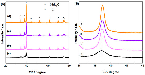 Figure 1 shows the XRD patterns of the catalysts. The diffraction peaks at 2θ = 34.4, 38.0, 39.5, 52.3, 61.7, 69.7 and 74.9° belong to β-Mo2C phase (PDF#72-1683) [28]. For the MC catalyst, only the diffraction peaks of β-Mo2C phase were detected. For the MC-Ni-X catalysts, besides the β-Mo2C phase, a new diffraction peak appeared at 2θ = 44.4°. It can be attributed to n-diamond type carbon phase (PDF#43-1104). No diffraction peak of Ni species is observed in Figure 1, indicating that Ni species are highly dispersed in the catalysts. The enlarged XRD patterns (Figure 1B) show that with the increase of the nickel content, the diffraction peak at 2θ of 39.5° gradually shifts to higher angles. It indicates that Ni2+ cations with smaller ionic radius than Mo2+ cations are doped into the molybdenum carbide lattice, which makes the crystal plane spacing smaller [51]. Compared with the MC catalyst, the diffraction peak intensity of the β-Mo2C phase of the MC-Ni-X catalysts increases sharply. It suggests that the crystallinity of β-Mo2C crystals in the Ni-doped catalysts significantly increases. The average size of β-Mo2C crystals was calculated by Scherrer formula, as listed in Table 1. The results show that the size of β-Mo2C crystal in the MC-Ni-X catalysts is about twice larger than that of the MC catalyst.