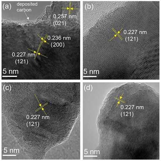 Figure 2 shows the HRTEM images of the catalysts. We observed the (121), (200) and (021) planes of Mo2C in MC catalyst, but only observed (121) plane in Ni-doping catalysts. Figure 2a shows that some carbon is deposited on the surface of the MC catalyst, and the amount of carbon deposition on the surface of the MC-Ni-X catalysts is significantly decreased by Ni doping. No Ni-related crystal is observed in the TEM images of the MC-Ni-X catalysts, indicating that Ni atoms are doped in Mo2C, which is consistent with the XRD results.