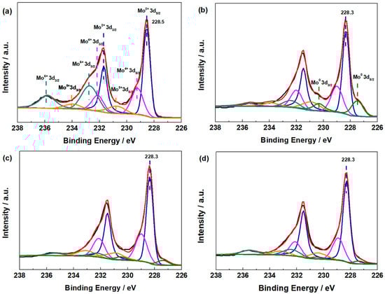 Figure 4 shows the Mo 3d XPS spectra of the catalyst. There are four binding energy peaks in the Mo 3d5/2 region of the MC catalyst. The peaks at 228.5, 229.1, 231.3 and 232.8 eV are assigned to Mo2+, Mo4+, Mo5+ and Mo6+, respectively [55,56]. The MC-Ni-X catalysts have a new binding energy peak at 227.0 eV, which belongs to Mo0. Table 4 lists the relative contents of various valence Mo species on the catalyst surface calculated according to the XPS peak area. Compared with the MC catalyst, the peak position of Mo2+ on the MC-Ni-X catalysts shifted about 0.2 eV towards lower binding energy. It indicates that there is partial electron transfer from Ni to Mo, which increases the electron cloud density of Mo species in the catalyst. It is beneficial to non-dissociative adsorption and insertion of CO to produce mixed alcohol [40,42].
