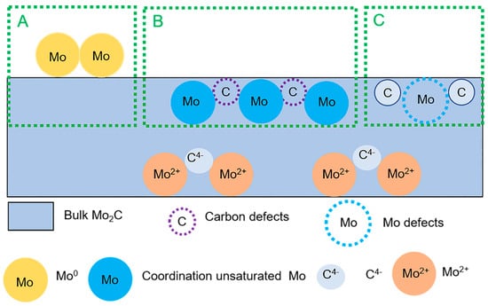 Schematic diagram of Mo2C surface. (A) Mo0, (B) carbon defects and (C) Mo defects.