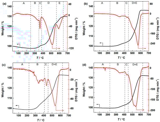 Figure 6 gives the TG and derivative thermogravimetry (DTG) curves of the catalysts. The DTG curve of the MC catalyst can be divided into five temperature ranges, which are marked as stage A, B, C, D and E. In order to determine the oxidation process corresponding to each temperature range, the samples obtained by oxidizing the MC catalyst at different temperatures (MC-T) were characterized by XRD.