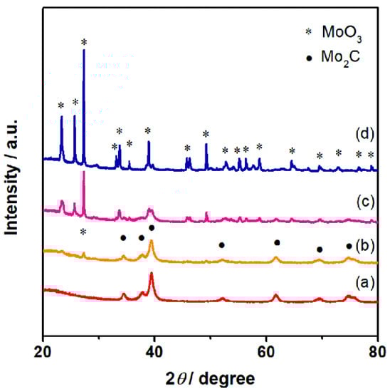 The weight loss below 250 °C can be attributed to the removal of adsorbed impurities on the catalyst surface. The MC-270 sample corresponds to stage B of the DTG curve. According to the XRD results (Figure 7), the composition of the MC-270 sample is similar to the MC catalyst, which exists as the β-Mo2C phase (PDF#72-1683). However, the XPS results (Figure S3 in Supplementary Materials) show that the surface of the MC-270 sample is mainly composed of Mo6+ and Mo5+, indicating that the catalyst surface has been oxidized to molybdenum oxide. Therefore, we attribute the weight gain in stage B to the oxidation of surface Mo2C. Since the oxidation temperature of stage B is relatively low, the carbon deposited on the surface has not been oxidized, so it can reflect the number of carbon atoms in the surface molybdenum carbide lattice.