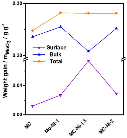 The ratios of the surface, bulk phase and total weight gain of the catalysts to the total weight of MoO3 obtained by the complete oxidation of the catalysts, calculated from the TG analysis results.