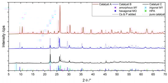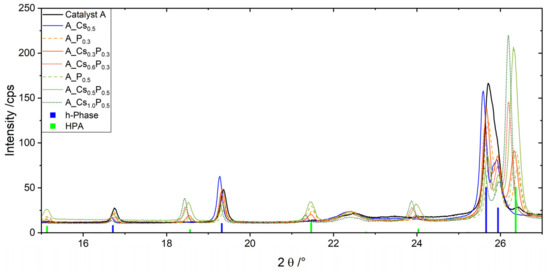 It should be investigated whether the formation of HPA is the only reason for the increased selectivity of the catalysts or if adding only Cs also has an effect. Furthermore, the influence of Cs on the formed HPA phase is of interest. Different ratios of Cs/P and (Mo + V + W)/P were added to the catalysts. Since catalyst A with added Cs and P features the highest MAA selectivity and exhibits the best capability of forming a heteropoly acid, results for catalysts B and C will not be shown. Catalysts B and C showed similar effects as catalyst A for all following experiments. The corresponding results can be found in the Supplementary Materials.