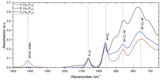 IR spectra of catalyst A_Cs0.6P0.6, B_Cs0.5P0.6 and C_Cs0.5P0.5 normalized to the characteristic (ν)-P-O-vibration at 1062 cm−1.