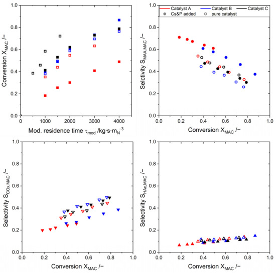 Catalytic performance of catalysts A, B and C at 300 °C and 21% v/v water prior to (empty circle) and after adding Cs and P (filled circle) with (Mo + V + W)/P and (Mo + V + W)/Cs ≈ 18. MAC Conversion over the modified residence time (top left), MAA selectivity over MAC conversion (top right), COx selectivity over MAC conversion (bottom left) and acetic acid selectivity over MAC conversion (bottom right).