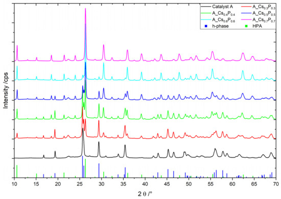 XRD pattern of catalyst A prior to and after adding Cs and P in different Cs/P and (Mo + V + W)/P ratios. Characteristic XRD reflexes of h-phase (blue bars) and HPA (green bars).