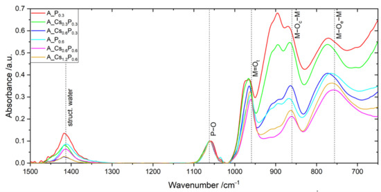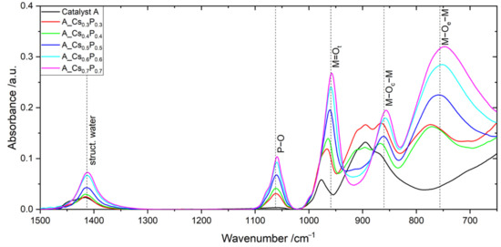 IR spectra of catalyst A prior to and after adding Cs and P with different (Mo + V + W)/P and Cs/P ratios are shown in Figure 9. Here, the IR spectra are normalized to the characteristic P-O band at 1062 cm−1. The ratio of the constitutional water vibration band (1413 cm−1) to P-O vibration band decreases with increasing Cs/P ratio, proving a greater salification of the HPA phase with higher Cs/P ratios.