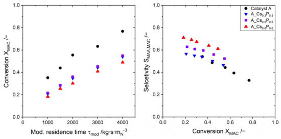 If only Cs is added to the h-phase, the MAA selectivity slightly decreases. The catalyst activity is not effected by Cs addition. Corresponding data can be found in the Supplementary Materials as well. Hence, it can be concluded that Cs does not affect the catalyst in a positive way.
