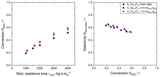 Figure 11 shows the catalytic performance of A_Cs0.5P0.5 at 300 °C for the fresh state, 0.5 molMAC/gcat converted and 1.0 molMAC/gcat converted. Similar to the observations of Marosi et al. [13] the MAA selectivity initially rises by 3–5%, but decreases by 2–3% upon a MAC conversion of 1.0 molMAC/gcat, indicating a catalyst deactivation. The same effect can be observed for the directly synthesized HPA phase (Supplementary Materials). With increased catalyst age, the catalyst activity of A_Cs0.5P0.5 rises to about 120% of its initial value, which can be linked to an increase in catalyst surface area (Table 4).