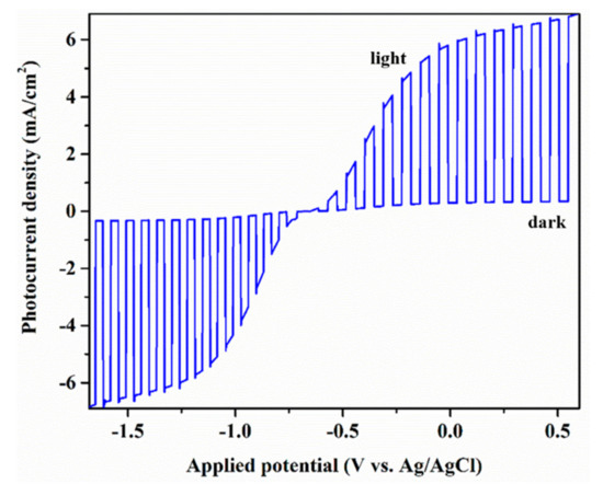 Voltammogram run in 0.5 M Na2SO4, chopped light for the S3 nanosheet photoanode at 50 mV s−1.