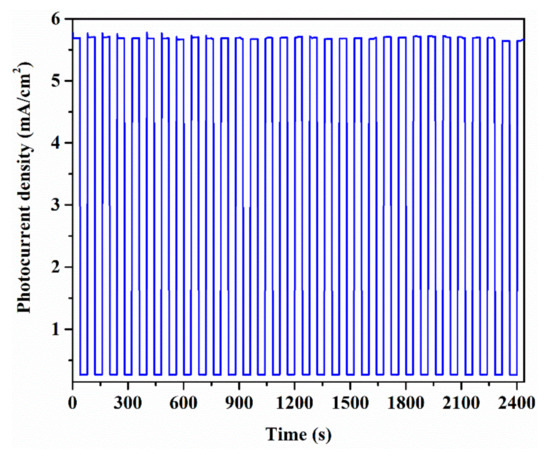 The responsibility of the film could be obtained by using chopped visible light with switching from the “OFF” state to the “ON” state. Chopped light was executed under 0.05 V implied sample versus Ag/AgCl for the stability measurement. The results are illustrated in Figure 6. The photocurrent takes 0.5 s to respond and decay, indicating that it is a rapid response current. The 5.68 mA cm−2 photocurrent density was only reduced by 1% after 40 min. It is noteworthy that the SnS nanosheet photocurrent densities exhibited good behaviors after 2400 s of irradiation on stability (1% decrease) (Figure 6).