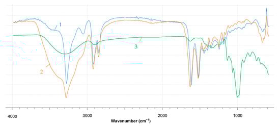 FTIR spectra with ATR of representative samples: 1—empty PA6 support; 2—PA6-L; 3—native laccase.
