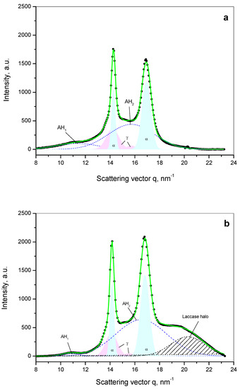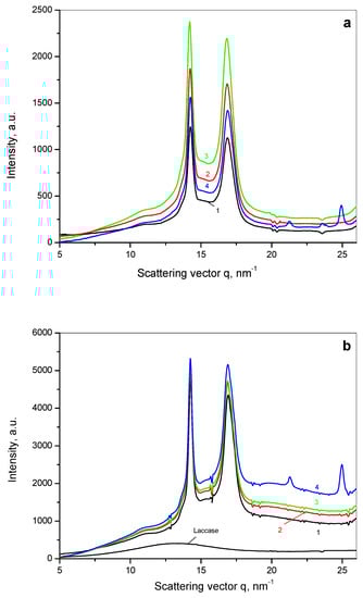 The patterns of the PA6@L samples presented in Figure 4b display no significant change of the form or position of two reflections assigned the monoclinic α-PA6. However, after laccase adsorption, a hump in the baseline appears at higher q-values due to an additional diffuse scattering (halo) related to the adsorbed laccase. Figure 4b also displays the pattern of the free laccase producing a wide scattering peak typical of disordered materials centered at . This means that the free lyophilized laccase is amorphous at the length scale of various angstroms that is probed by WAXS.