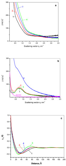 Linear SAXS patterns after background subtraction and Lorentz correction of: (a) Empty PA6 supports; (b) PA6@L and (c) linear correlation function of the empty supports. 1—PA6; 2—PA6Fe; 3—PA6FeP; 4—PA6Fe3O4. The laccase pattern is presented in Figure 6b for comparison. For more detail see Materials and Methods—Section 3.2 and Ref. [50].