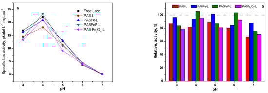 Influence of pH on the activity of free laccase and PA6@L conjugates: (a) Specific laccase activity and (b) relative laccase activity as a function of pH = 3–7. Conditions: CB 20mM, 37 °C. The black dash line in Figure 7b shows the 100% level of the free laccase.